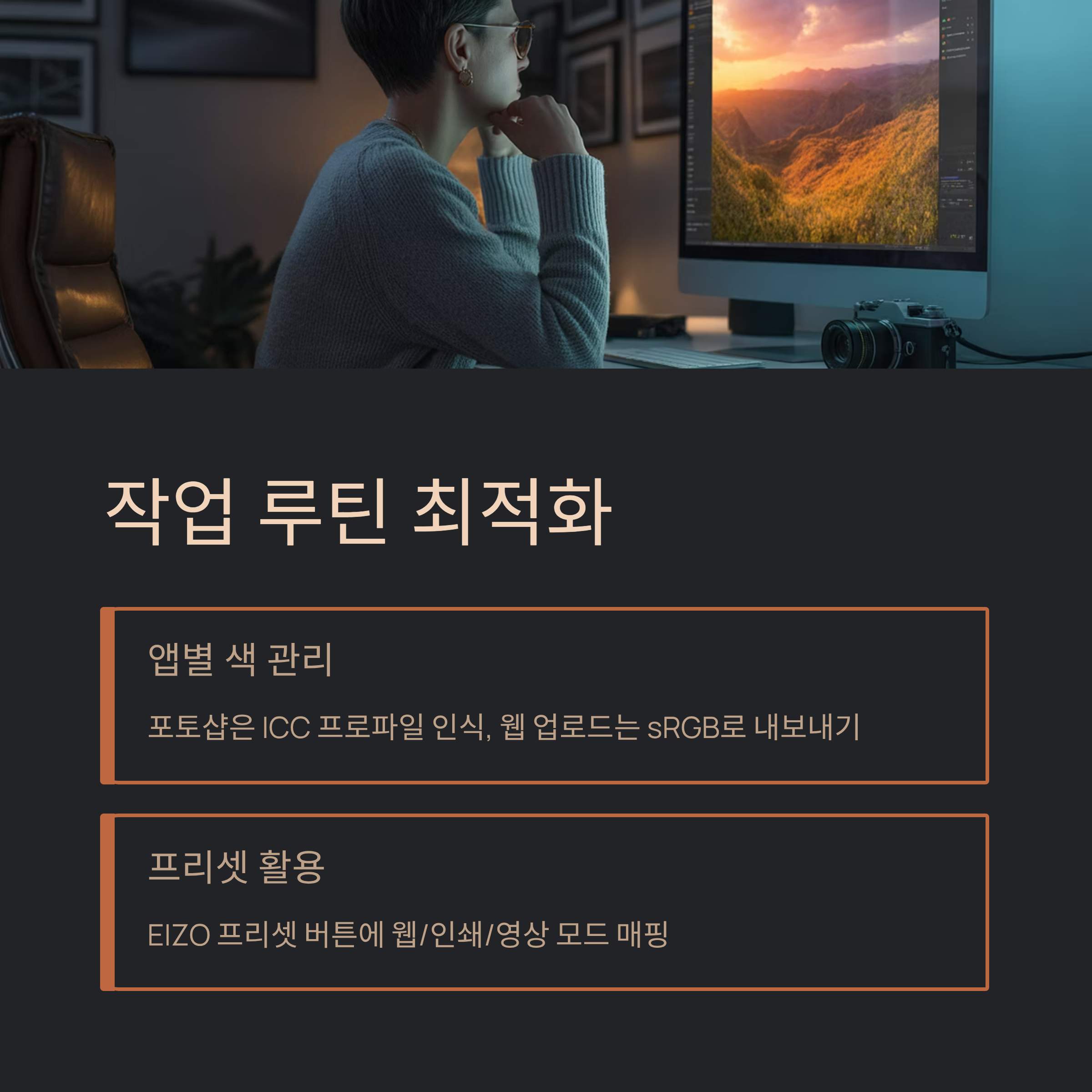 프로파일은 프로젝트별로 묶어두면 헷갈리지 않아요. 인쇄 작업은 CMYK 기준 파일과 스크린샷 가이드, 프리셋(액션·LUT)을 폴더로 묶고, 영상은 색공간·감마·프레임 정보를 템플릿에 적어 둬요. 그리고 이 문단 중간에 한 번만 이름을 가볍게 끼워볼게요—EIZO 와 같은 전문 라인의 프리셋 전환 버튼에 ‘웹 sRGB/인쇄 D50/영상 BT.709’ 식으로 매핑해 두면, 장르가 바뀔 때 실수가 확 줄어요.